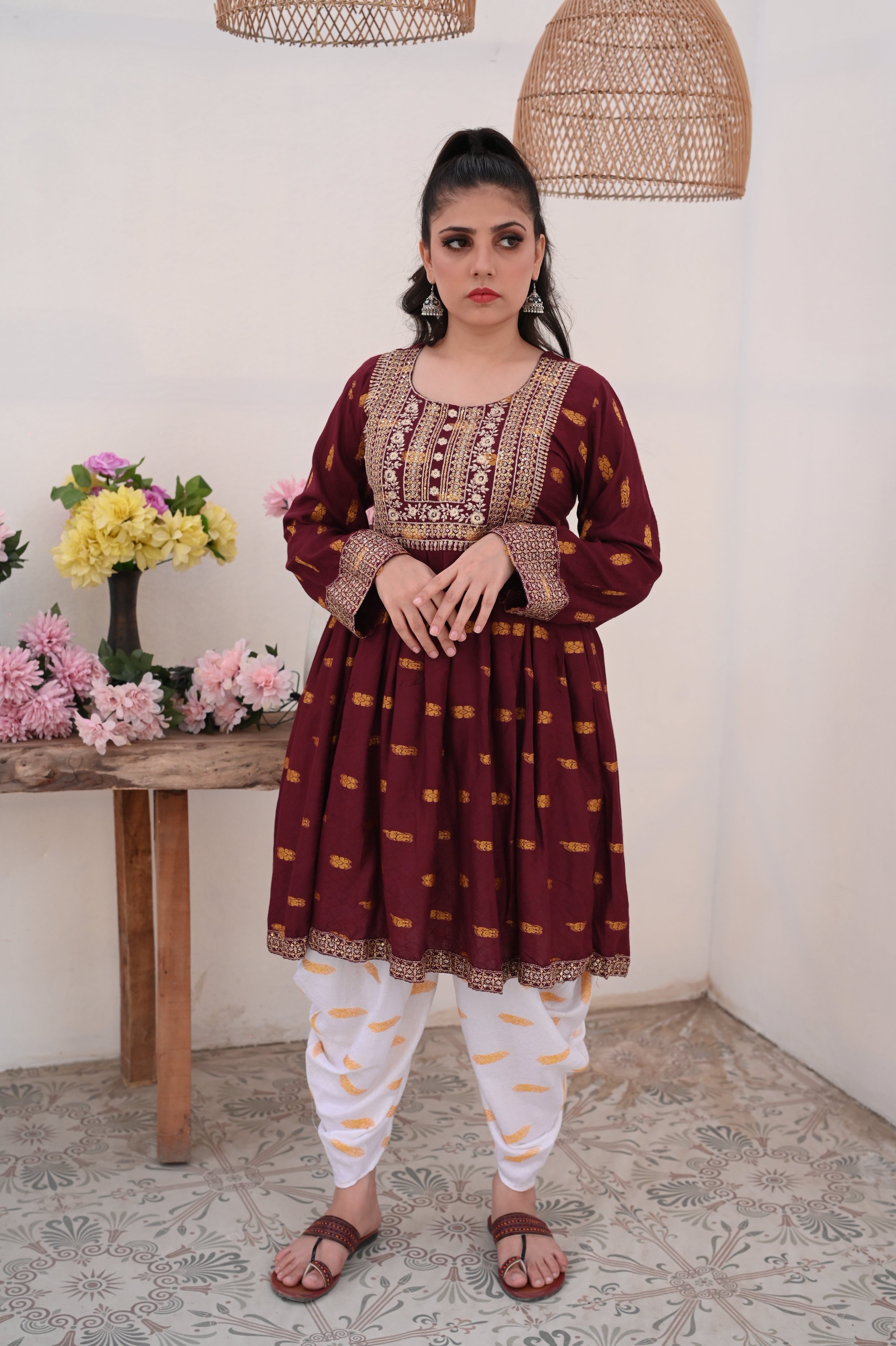 3-PC Embroidered Maroon & White Printed Dhanak Dress Ready to Wear With Machine Embroidery