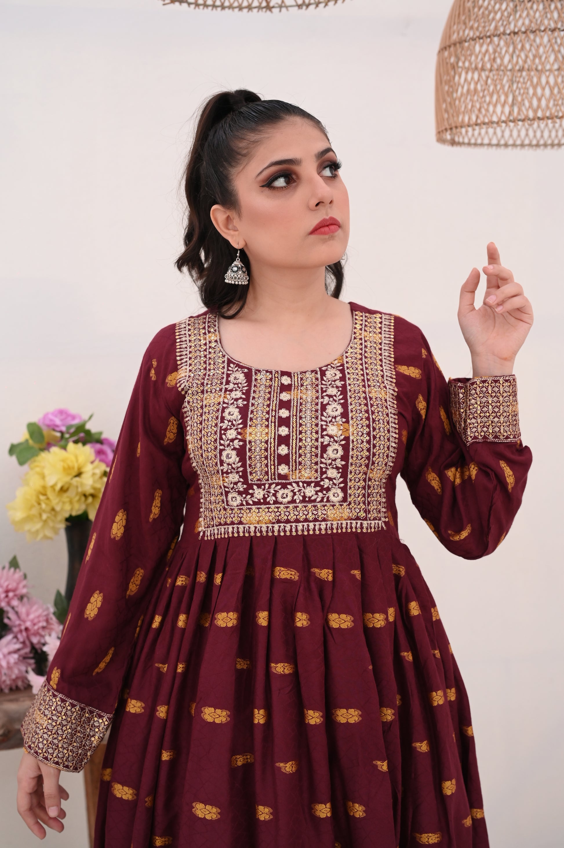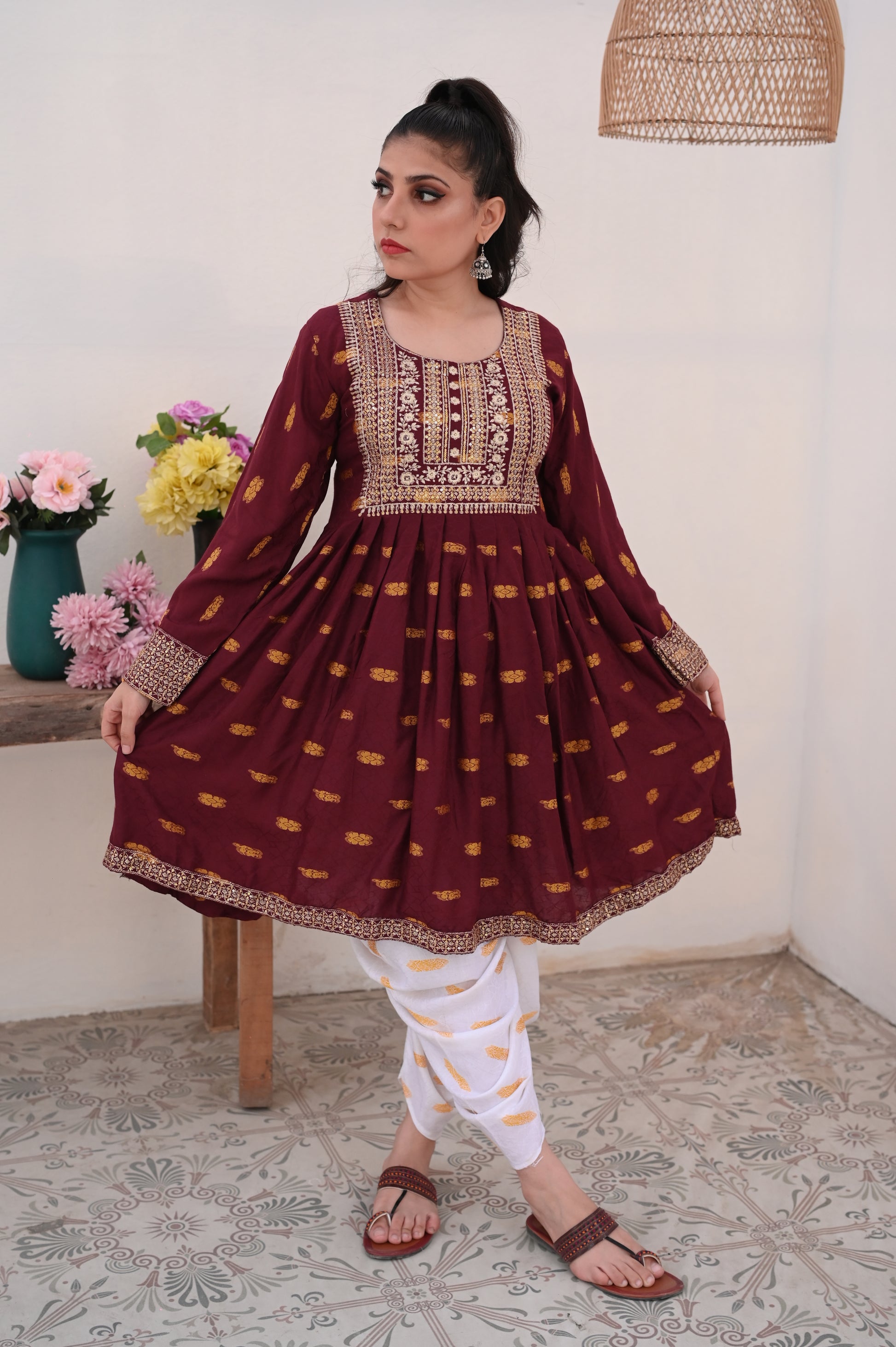 3-PC Embroidered Maroon & White Printed Dhanak Dress Ready to Wear With Machine Embroidery