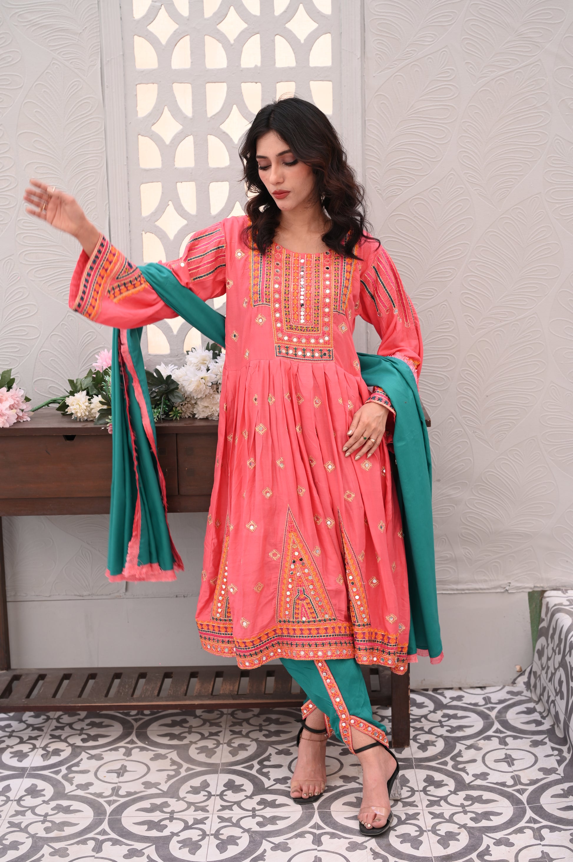3-Piece Anarkali Set in Pink โ Ready to Wear With Machine Embroidery